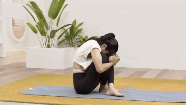 • Étape 1 : Se mettre en boule en s’asseyant et en arrondissant le dos. Il s’agit d’une variante de la pose de yoga du « chat assis ».