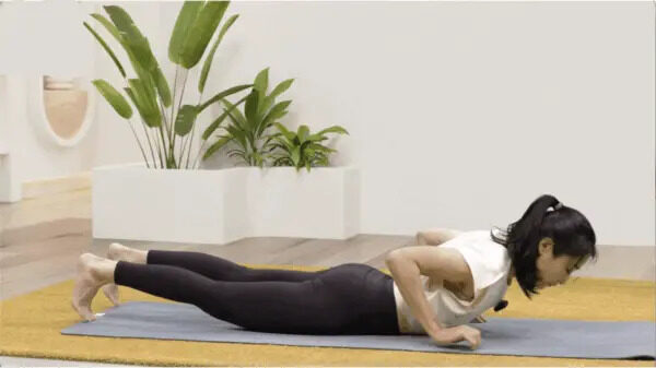 • Étape 1 : S’allonger face au sol, les mains placées de chaque côté de la poitrine, les coudes pointant vers le haut.