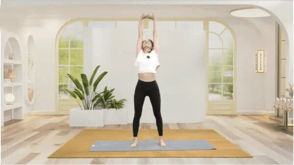 • Étape 1 : Lever les bras au-dessus de la tête, les doigts entrecroisés, et redresser la taille et le dos. Tourner les paumes vers le haut et étirer simultanément les muscles du dos, des bras et des épaules vers le haut.