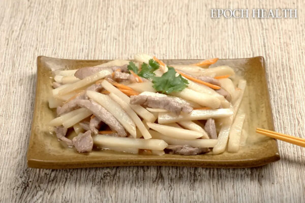 2. Faire chauffer l’huile dans une poêle, ajouter les oignons verts hachés et la sauce soja, et faire revenir jusqu’à ce qu’ils soient parfumés. Ensuite, faire sauter les lanières de porc.