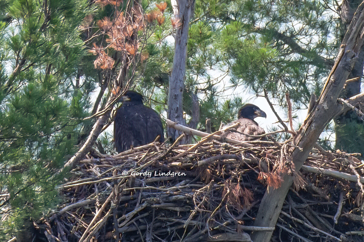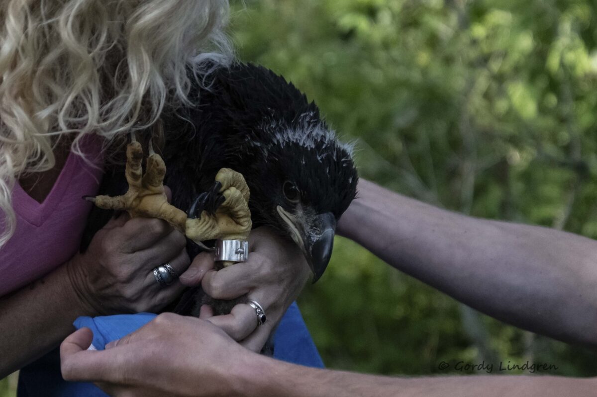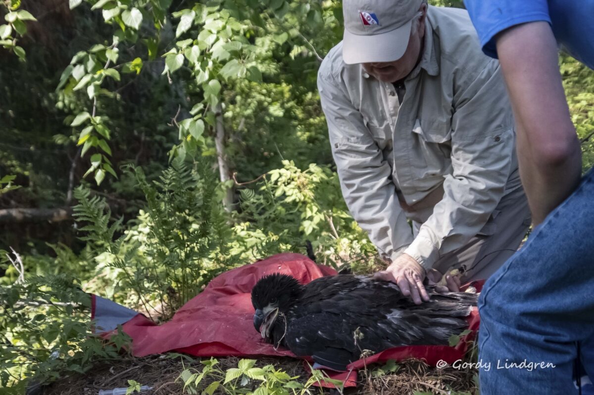Lorsque Mme Naumann est arrivée à Voyageurs dans l’après-midi, l’oisillon était « un peu déshydraté », mais il s’est rapidement ressaisi après avoir bu de l’eau. Un trio composé de Mme Naumann, du chercheur Bill Bowerman et du biologiste spécialiste des aigles Michael Wierda a fait sortir une femelle plus âgée de son nid pour lui faire une prise de sang, avant de ramener les deux oisillons ensemble au nid.