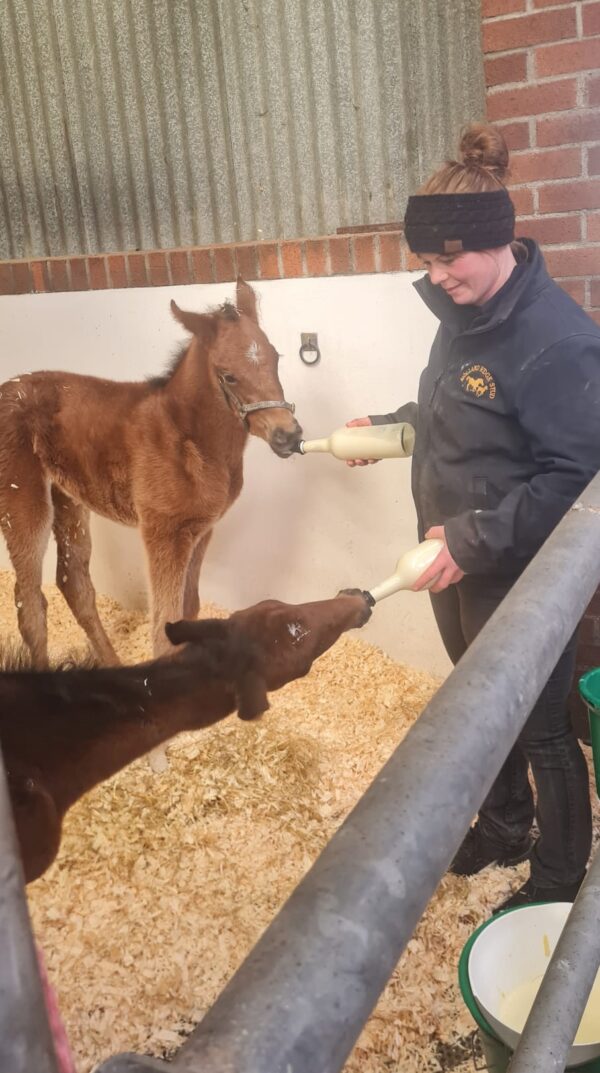 « Si un type de jument pouvait s’occuper de deux purs-sangs, ce serait une Shire ou une Clydesdale, car elles ont beaucoup de lait et sont d’une grande gentillesse », explique Jess Westwood. « Elles sont aussi naturellement plus décontractées que les purs-sangs, ce qui fait qu’il est moins risqué de les présenter à des orphelins. Cath était tout à fait disposée à donner à Sammy l’occasion d’accueillir les deux poulains. »