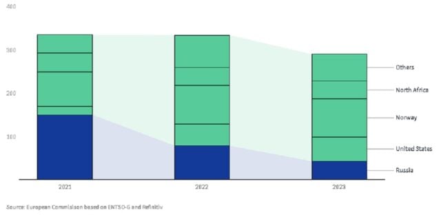 La quantité totale de gaz importé par l’UE (gaz naturel plus gaz naturel liquéfié [GNL]) est également passée de 334 milliards de mètres cubes en 2021 et 2022 à seulement 289,9 milliards de mètres cubes en 2023. La part respective de la Russie serait passée de 44,93 % (150,2 milliards de mètres cubes en 2021) à 14,8% (42,9 milliards de mètres cubes en 2023) durant la même période.