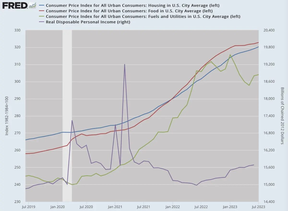 À quoi consacrez-vous votre argent chaque mois ? Le loyer ou le prêt hypothécaire, la nourriture à la maison ou à l’extérieur, les services publics et l’essence. Ce sont les catégories de base. L’indice des prix à la consommation inclut bien plus que cela, certains produits que vous n’achetez pas et d’autres qui augmentent beaucoup moins que d’autres. Examinons donc les chiffres du gouvernement sur ce que vous achetez réellement, c’est-à-dire les produits et les services que vous consommez et qui représentent une part importante de votre revenu. Revenons trois ans en arrière.